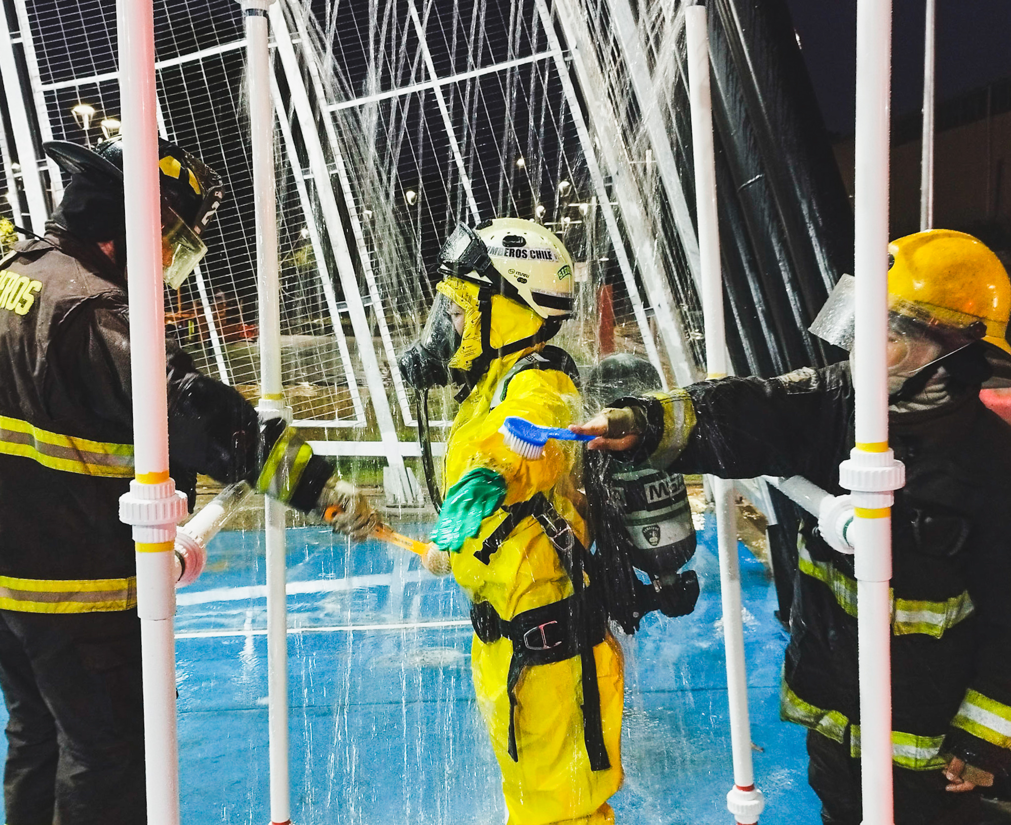 Piscinas y duchas portátiles para establecer corredores seguros de limpieza química.